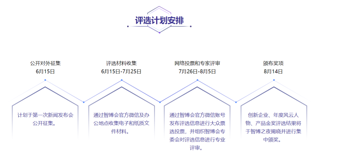 据了解,2020全球智博会系列奖项评选活动程序按照发动征集、确定候选名单、投票评选、颁奖典礼和媒体宣传等五个步骤进行。
